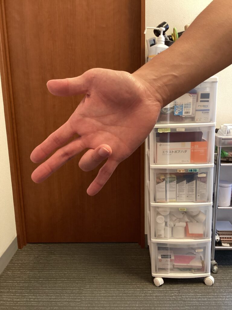 3週間程前に自転車で走行中に転倒し左の手掌を打撲した。転倒した翌日に整形外科を受診し骨折などはなかったので安静にしているうちに打撲の痛みは軽減していった。最近、人差し指(示指)と中指(中指)に痺れを感じるようになり、力が入りにくくお茶碗を落としてしまうことある。