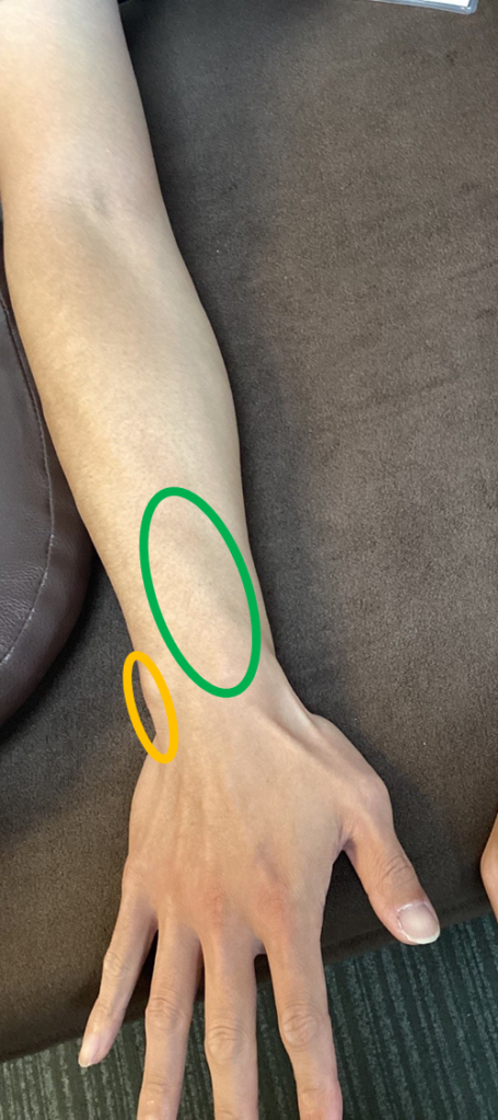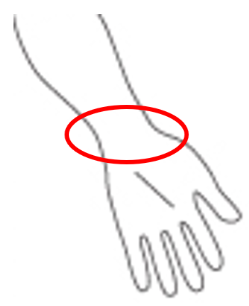 半年前から整体の仕事を始めた。最近になって右手首が痛むようになり仕事に支障が出るようになってきた。物を摘まんだりドアノブを回したりすると激痛が走るようになってしまい当院に来院(〇が痛みの箇所です)。