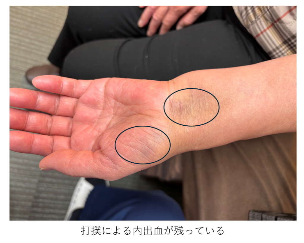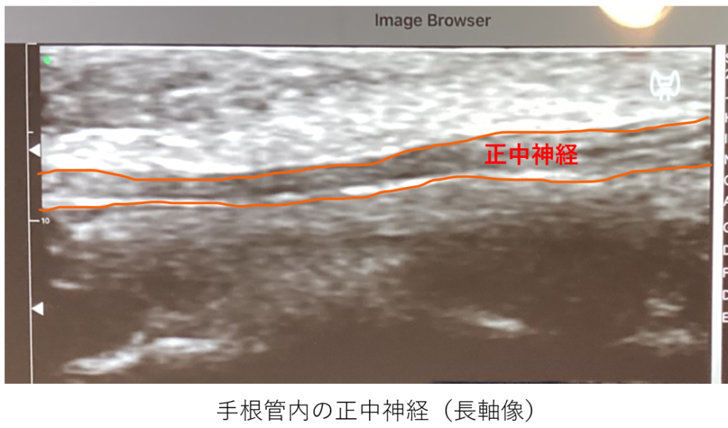 左手関節の掌側に打撲による内出血が確認できた。手根管と叩くと痺れが強くなり、ファーレンテストも陽性であった。打撲による内出血で手根管の内圧が上昇し正中神経が障害と受けていると予想された。エコー画像診断装置で手根管内を観察したところ、正中神経自体は損傷を受けていないようにみえた。筋の萎縮や神経の損傷はないので、手根管の内圧を下げることで改善がみられと判断し治療を進めることなった。初回は、手技療法、超音波治療、ストレッチを行った。