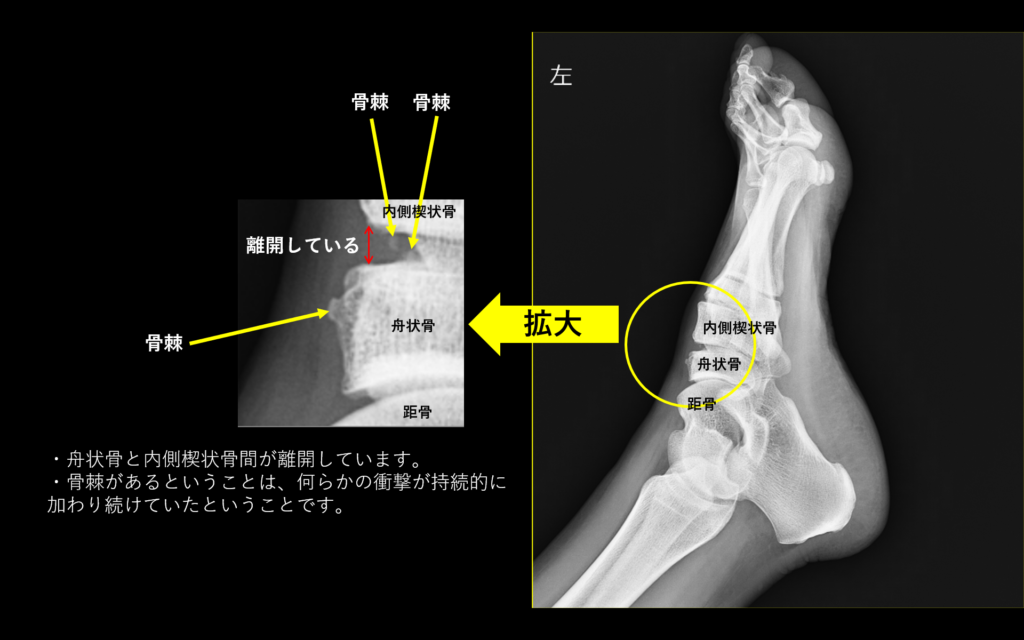 レントゲンとMRI撮影の結果、骨傷の所見はみられなかったが、舟状骨と楔状骨間が離開しており周辺に骨棘が確認できた。画像所見と腫れ及び圧痛の部位が一致していることから、この離開と骨棘が痛みの原因であると判明した。治療の方針としては、患部に対する物理療法と足部のアライメント修正を行うこととした。