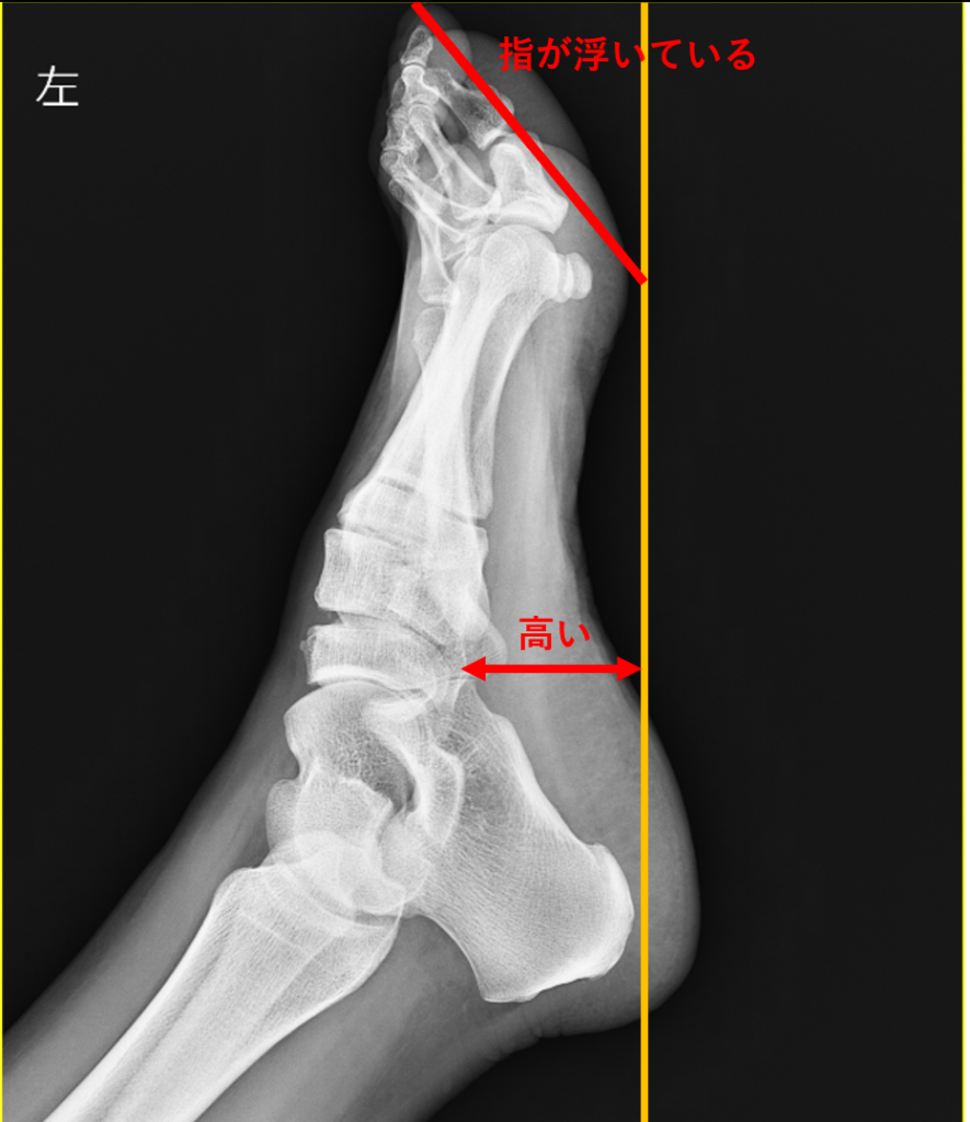患者様の足は、内側縦アーチ(土踏まず)が高い甲高の足で、足趾は浮指となっていた。