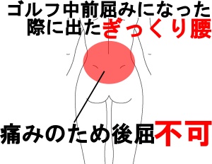 ゴルフのプレー中、前屈み姿勢をとった際に急性の腰痛が発症した。腰部から骨盤周辺に強い疼痛があり、特に後屈動作がほぼ不可能で、右側屈時にも痛みを伴っていた。もともと腰痛を繰り返しやすく4月末には腰椎ヘルニアの手術しており、経過観察中であったため痛みによる恐怖心からぎこちない動きとなり、2日間の休職を余儀なくされた。