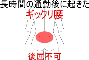 通勤時間が長く電車の椅子から立ち上がった際に痛みが出た。激しい腰痛により歩行時に跛行が見られ、常に前かがみの姿勢を強いられる状態で来院した。特に後屈時の痛みが顕著で、腰部には熱感を伴っていた。症状は初診2日前から出現し、仕事に行ったものの痛みのため帰宅を余儀なくされ、在宅ワークの申請を行うほどの状態であった。日常生活動作のほとんどが困難な状況であった。