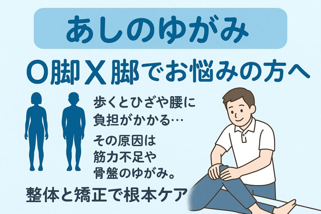「歩くときに膝がぶつかる」「脚のラインが気になる」「姿勢が悪いと言われる」――そんなO脚・X脚のお悩みは、見た目の問題だけでなく、腰痛や膝痛の原因にもなります。実はO脚・X脚は骨格そのものの形よりも、筋肉のアンバランス・姿勢習慣・生活動作のクセによる影響が大きいのです。当院にも「美容目的で脚をまっすぐにしたい」という方から「膝の痛みや歩きづらさを改善したい」という方まで、多くの方がご相談に来られます。